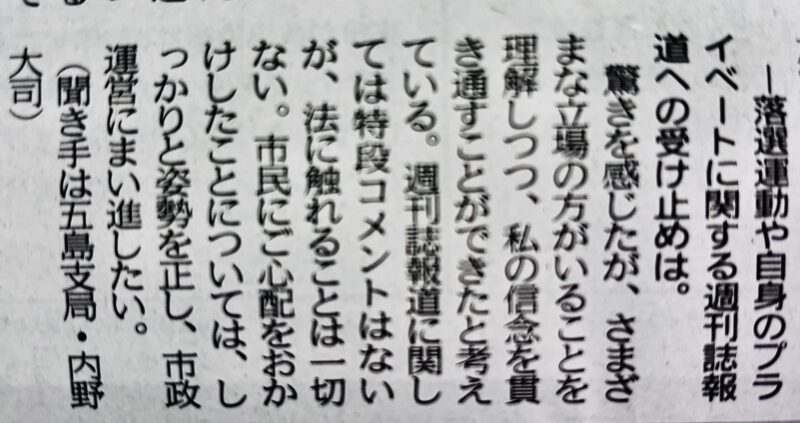 そのような人間が五島市の舵取り役。本来、市長という政治家という職業は、夜の密会を許容するほどゆるい仕事じゃないはずです。