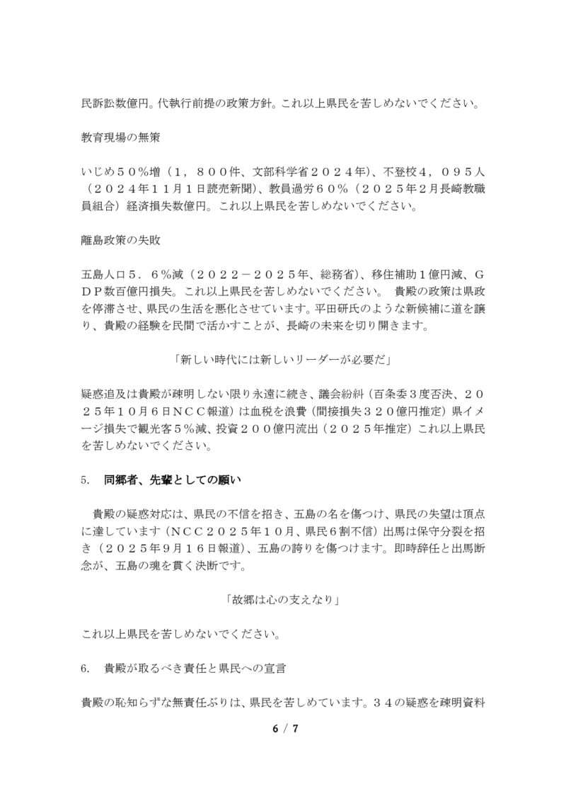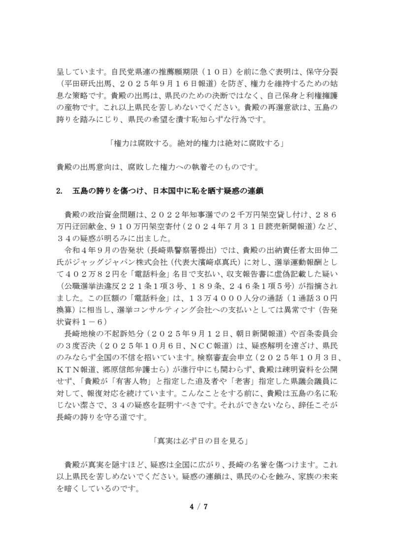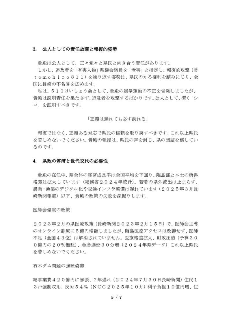スポンサーリンクブックマーク求む!長崎県五島市公務員・議員に対する「素行」情報提供【速報】来年の知事選挙冬の陣。使い捨てケンゴ(製造物責任:谷金Co., Ltd.)その他XFacebookはてブLINEコピー2025.10.262025.10.27来年の長崎県知事選では、自民党長崎県連は今日26日の選挙対策委員会で現職はの大石知事を支援せず、元国交省元副知事の平田研氏を推薦することになりました。五島市民の皆様、常識的にお考え願います!政治家は簡単に選んではなりません