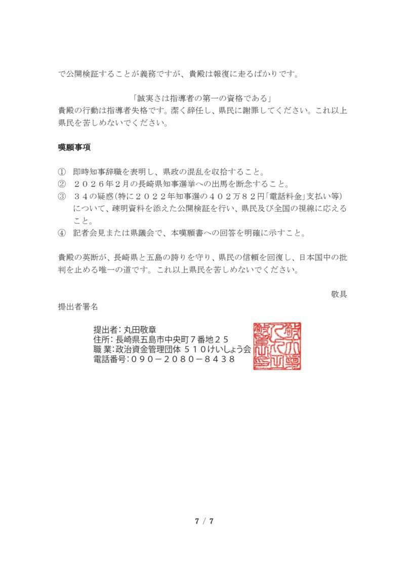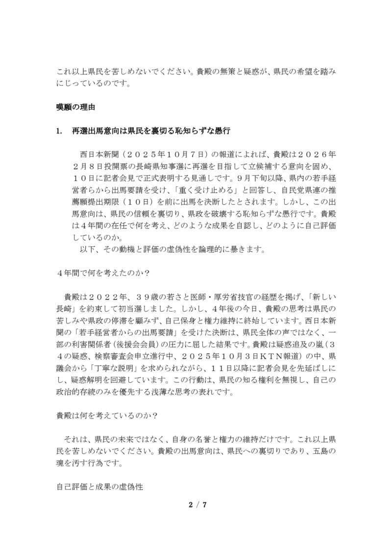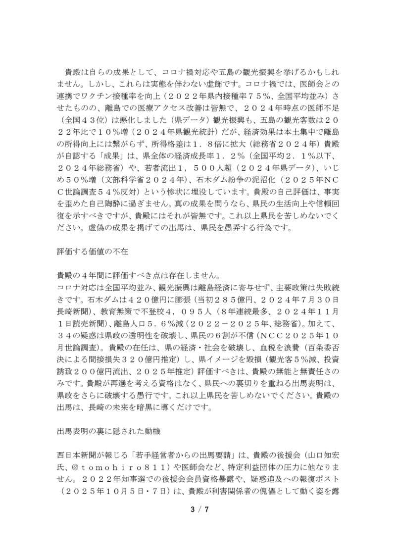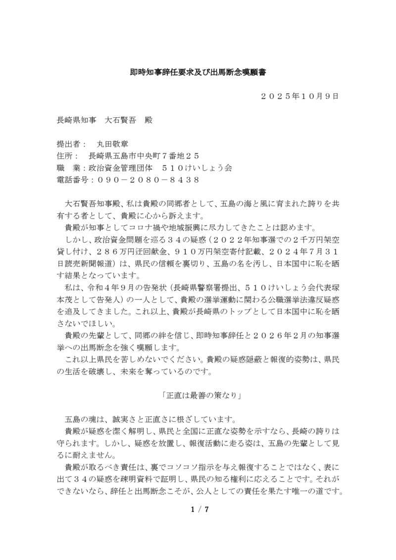 スポンサーリンクブックマーク求む!長崎県五島市公務員・議員に対する「素行」情報提供【速報】来年の知事選挙冬の陣。使い捨てケンゴ(製造物責任:谷金Co., Ltd.)その他XFacebookはてブLINEコピー2025.10.262025.10.27来年の長崎県知事選では、自民党長崎県連は今日26日の選挙対策委員会で現職はの大石知事を支援せず、元国交省元副知事の平田研氏を推薦することになりました。五島市民の皆様、常識的にお考え願います!政治家は簡単に選んではなりません