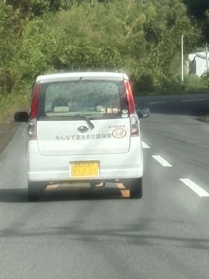 〇特徴: リアウィンドウに「五島市」「みんなで支える介護保険」のステッカーが貼付された公用車。