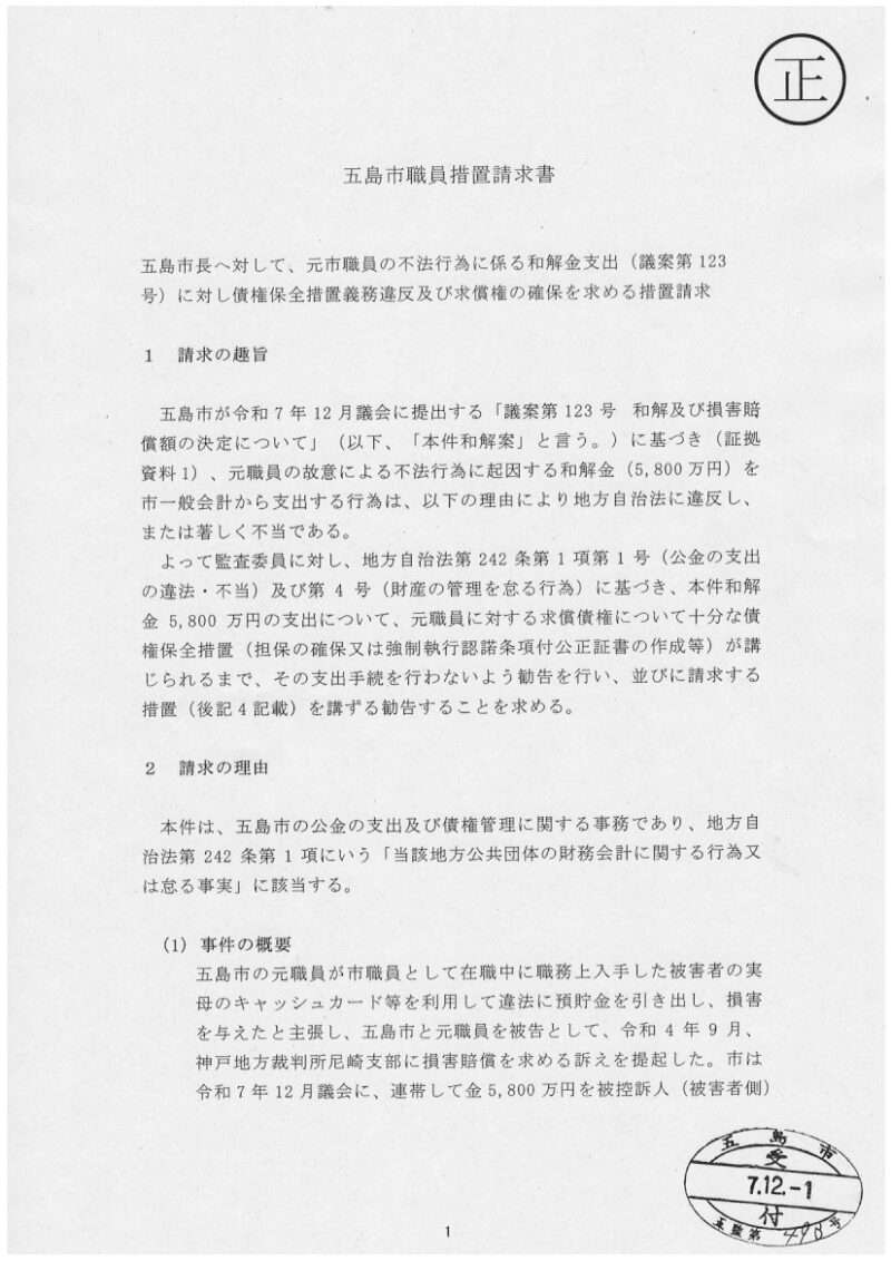 五島市の住民監査請求書は、元職員の不法行為に基づく和解金5,800万円の支出(議案第123号)について、その手続きの違法性または不当性を訴え、監査委員に特定の措置を勧告するよう求めています。