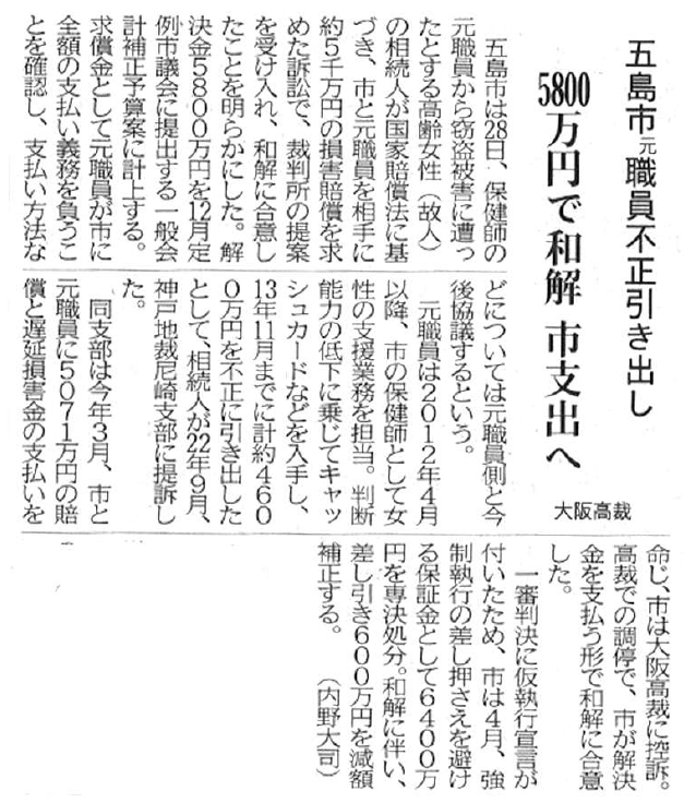 訴訟は市の元保健師が2012~13年、担当していた高齢女性の預貯金を不正に取得したとして、2年に相続人が約5千万円の賠償を求めていた。今年3月、神戸地裁尼崎支部が5071万円と遅延損害金の支払いを命じ、市は控訴後の調停で和解に合意した。(内野大司)