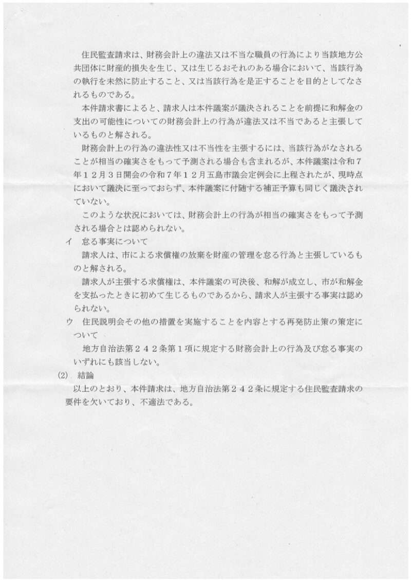 12月1日に提出した、元職員の不法行為に絡む和解金(5,800万円)支出差し止め等を求める住民監査請求について、本日(12月5日)、五島市監査委員より「却下(監査を行わない)」という通知が届きました。