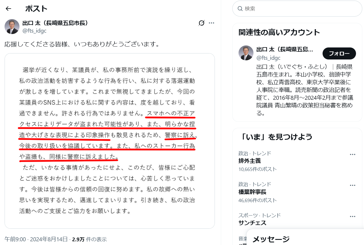 この不透明な後任人事の不在こそが、出口市長の「計画性のなさ」と「私情による市政運営」の何よりの証拠です。副市長が不在の間、市政の停滞による不利益を被るのは、他でもない私たち五島市民です。