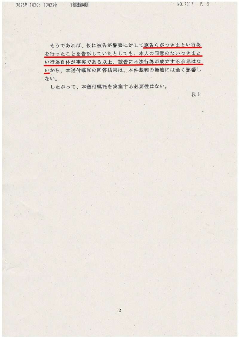 先日、原告提出の『長崎地方検察庁への文書送付嘱託』申請に対する、被告側の代理人弁護士から「文書送付嘱託(検察庁の記録取り寄せ)は必要ない」とする意見書が提出されました。彼らの言い分はこうです。