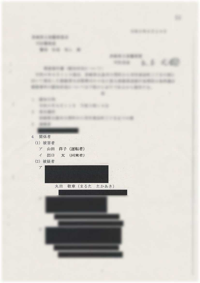 - 被害関係者:山田洋子(運転者)、出口太(同乗者)