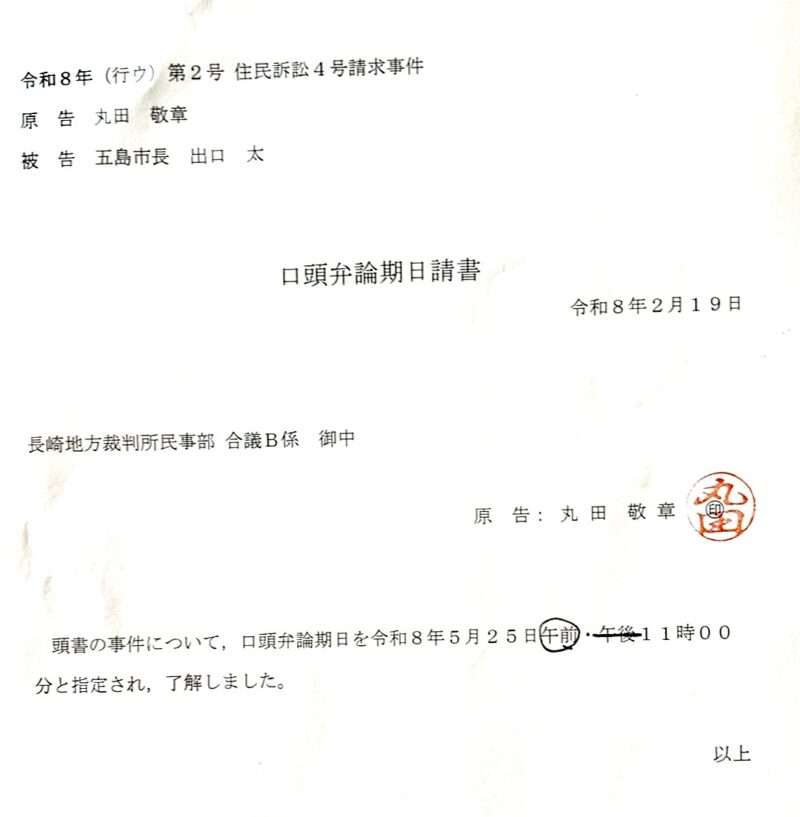 12日(木)、長崎地方裁判所より、被告(五島市長)へ訴状の受け取りが完了したとの連絡を受け、19日に第1回公判期日が決まりました。いよいよ、五島市の弔電送付における「ルールなき公金支出」の是非を問う裁判が本格的にスタートします。5月開始で時間的余裕があるので、じっくりと戦略を練っていきます。