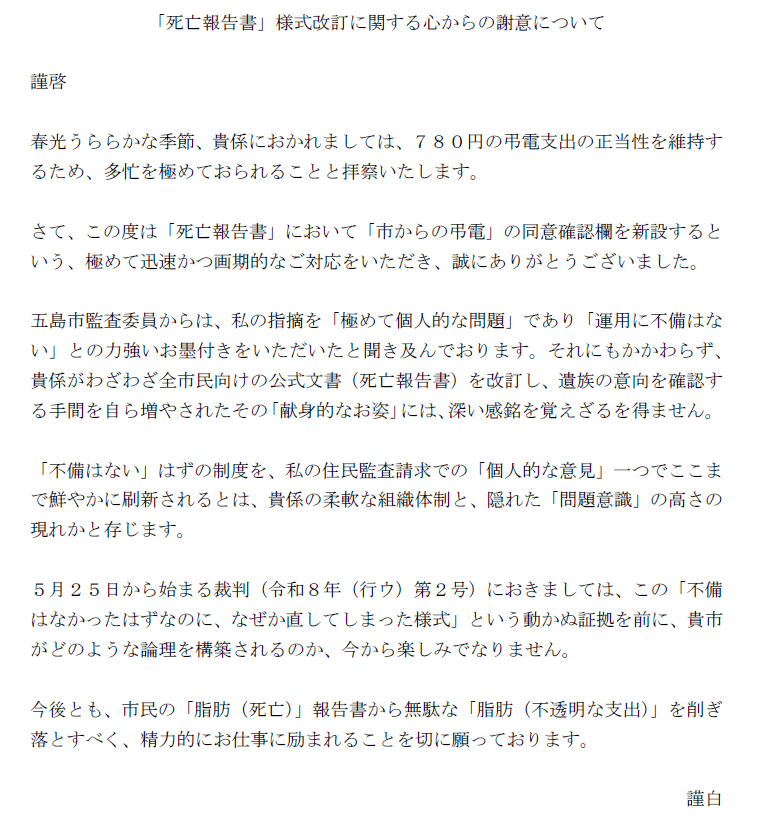 「脂肪(死亡)報告書」という打ち間違いには少し笑みがこぼれたのでは? 内容はまさに五島市の「無駄な脂肪(不透明な支出)」を削ぎ落とすための指摘です。5月25日からの裁判(令和8年(行ウ)第2号)では、この『直してしまった様式』を動かぬ証拠として、五島市の公金支出のあり方を厳しく問うていきます。」