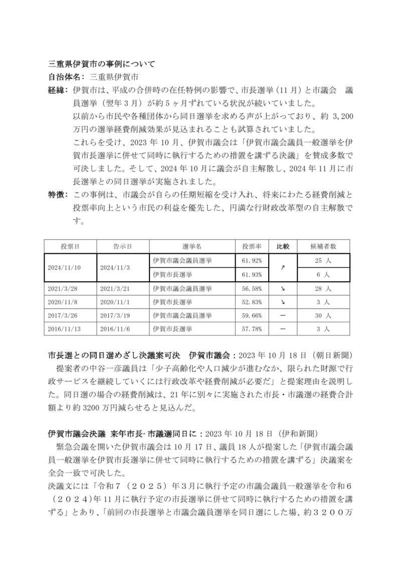 先進事例の提示:北海道赤平市や三重県伊賀市など、実際に自主解散によって同日選挙を実現し、成果を上げている自治体を例示
