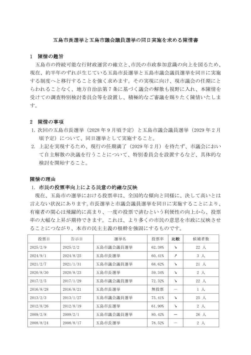 改めて、今回否決された「陳情第2号:五島市長選挙と五島市議会議員選挙の同日実施を求める陳情書」の中身を振り返り、何が議論のテーブルにすら載らなかったのかを整理します 。