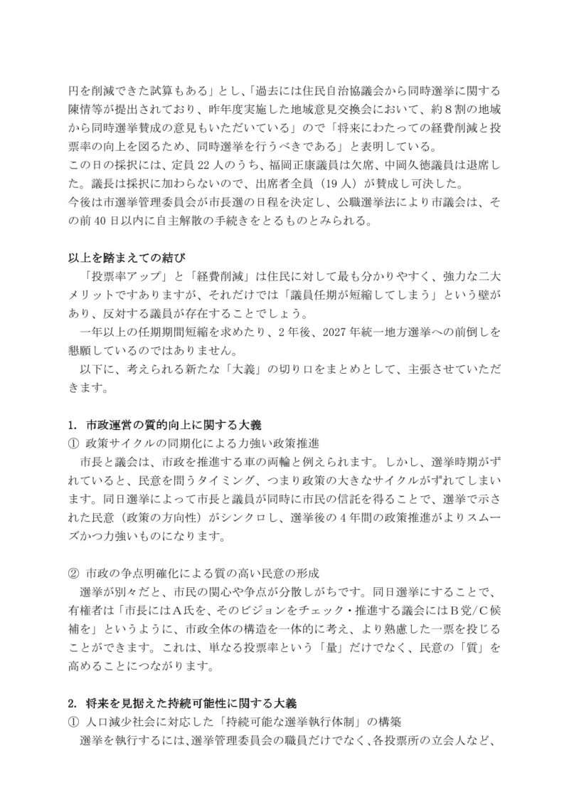 任期のズレを解消するために、市議会が自ら「自主解散」を選択し、市長選に時期を合わせるという決断を求めていた